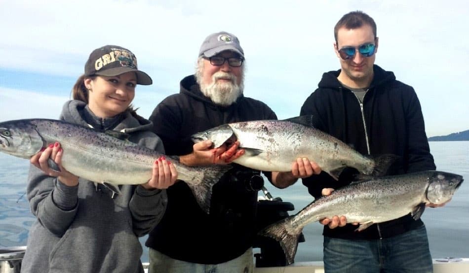 Generally the weather is pretty nice in the Summer months in Vancouver, in the low sixties to mid eighties Fahrenheit. In the Spring and Fall months it is cooler, in the low fifties to mid sixties. And regardless of what month it is, you can count on rain, that’s just the reality of Vancouver. Rare in the Summers, common in the Spring and Fall months and definitely in the Winter months. We suggest that when you book a Vancouver salmon fishing charter with us to have a peek at the weather forecast before hand and dress accordingly. Boats are covered and heated, so you’ll be comfortable even on cool wet days, but dressing right is key.